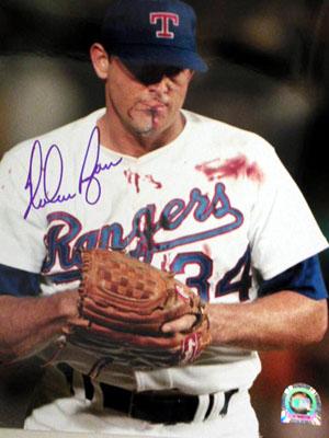 That's then-45-year-old pitching god Nolan Ryan. Bo Jackson had just finished smacking a baseball into his mouth at like 100 miles per hour. Lesser men would have gone straight to the clubhouse, but Nolan Ryan spat the blood onto his shirt, stayed in the game, and lived to sign the photo. It's such a powerful image that one can't look at it without saying AW JEEZ and puffing their mouth into weird shapes to make sure that all the teeth are still there. Just below this picture on the wall are wooden stand-ups of George Brett and Sammy Sosa as they observe the bloody picture.