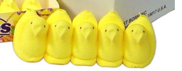 Peeps, for you foreign heathens who aren't acclimated to the ways of civilized society, are little marshmallow-shaped animals covered in a coating of hard colored sugar. They've got the texture and consistence of a dry sponge without any of the flavor and about a thousand more calories. Usually sold in packages of five, Peeps come joined side-by-side looking like some bizarre still-born siamese chicken fetus. On average, they'll retail for a dollar and change, but you'd be better served by wetting a bag of marshmallows, covering them in sugar, leaving them under the radiator for a few weeks and using that extra money on postage for when you've got to mail the business end of my shoe back to me after I lodge it up your ass for even contemplating buying them in the first place.