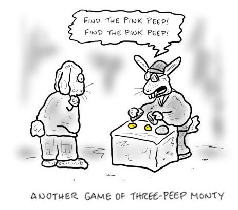 Three Card Monty is a time-honored game of chance in which the "mark" tries to uncover the solitary red card out of a set of three while the dealer bilks another idiot out of a bunch of money. What we see here is that same basic principle, with Peeps used in lieu of playing cards. Unless illustrating the basic fundamental of the game and showing children that its okay to swindle people providing they're dumber than you are is supposed to be the joke, I'm hard pressed to find cause for laughter. That's not comedy. That's just irresponsibility.