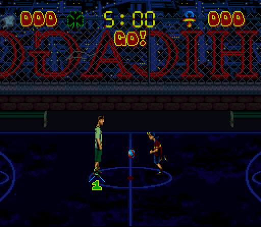 Ah yes, Gary Coleman using the Dennis Rodman Hair Care Kit. If you'll notice, they even managed to make your second opponent shorter than your first. He's so short that -- no exaggeration -- you can stand over him when he tries to shoot and the ball will automatically go into your hands. Marvellous. Note how Coolio can't bear to face him or he'll break out laughing. Also note the audience comprised of one Shriner elf.