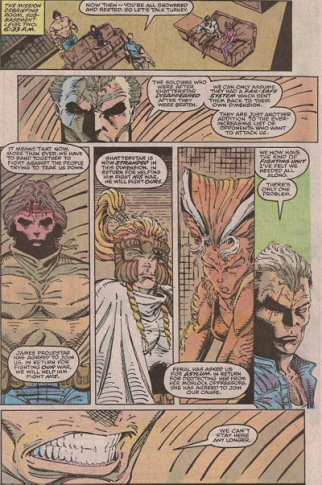 I've never though to question Rob Liefeld's sexuality, what with all the anatomically incorrect women and all, but I have to question whatever it is that keeps him from drawing a man's area without making it look he's got a fucking snow shovel shoved down the front of his pants. Look at Rictor's enormous area, it's almost as wide as his waist. As I write more of these it gets harder for me to write anything but LOOK AT THAT and WHAT IS GOING ON WITH THE GLOVES, WHY DOES EVERYONE ON THE TEAM WEAR SHORT SLEEVES AND GLOVES.