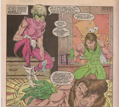 But I invite you to check out that Bart Simpson poster in the background. Not only is it TOPICAL~ but it's a blatant exercise in dissecting Rob Liefeld's shortcomings. He doesn't have the patience for uniformity or technique, so Bart's hair spikes are all different sizes. He doesn't have the natural talent to draw a curve without having it end in a rippling lat, so Bart's fingers look like butterknives. He doesn't have the perspective to recognize how sizes and shapes relate to each other, so Bart has an Alfred E. Newman ear growing into his cheek. Rob, couldn't you have just traced a picture of Bart Simpson into the background? We all know you don't have any qualms about tracing.