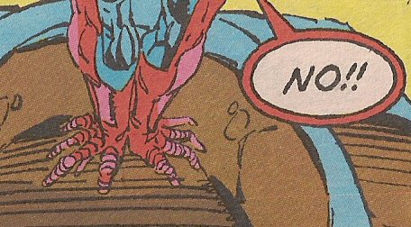 And he replaces Spider-Man's normal man hands with lumpy, four-pronged talons.