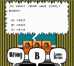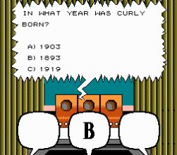 The trivia question are IMPOSSIBLE for anybody but those assholes in Three Stooges shirts where they're all dressed to play golf. What year was Curly born? What was the name of Larry's second cousin in "ALOOF ON THE ROOF?" How hard was Moe's cock in "ERECTION IN THE CONFECTION?"