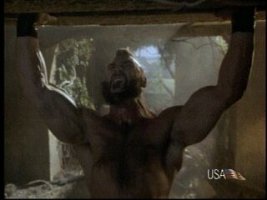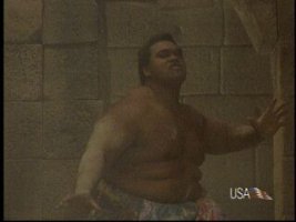 In the movie: Balrog is an ex-champion boxer who's career was ended by Bison. Honda is an ex-sumo champion who's career was ended by Bison. Why Bison has anything to do with who becomes the boxing or sumo champions I'll never know. I thought he wanted to take over Thailand and show off his vest that will bring him back to life in case he ever gets thrown into electrical equipment. Anyway, Honda and Balrog are butt-buddies posing as Chun Li's camera crew. They get easily captured, causing perhaps the most serious case of gay love ever captured in a film about a video game. Honda gets held down and whipped while Balrog watches. Honda no-sells it as Balrog admires him affectionately. Usually when I'm making gay jokes I don't really have anything to back it up, but on the Street Fighter DVD (SPECIAL COLLECTORS EDITION) the director of the film himself says, "I didn't realize that this scene would come off as being so homoerotic."