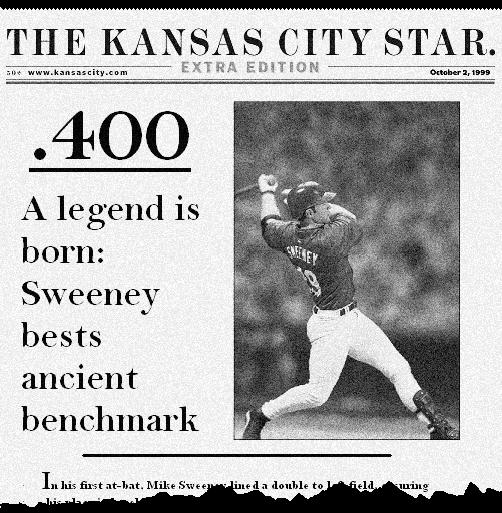 That year, Mike Sweeney hit .400. On the final day of the season, a capacity crowd of 40,793 filled Kauffman Stadium. Sweeney roped a double to left field off Tigers pitcher Dave Mlicki in the first inning to guarantee it. When he did, the crowd stood, and cheered, and did not sit again for twenty-eight minutes. "Well, the way we figured it, the rest of the world don't care about him," said a fan. "We want to make sure he knows we love him." |