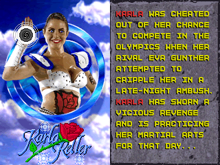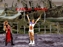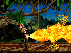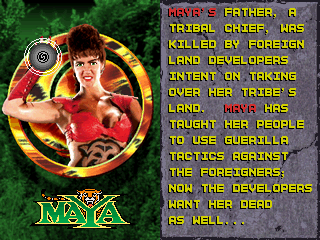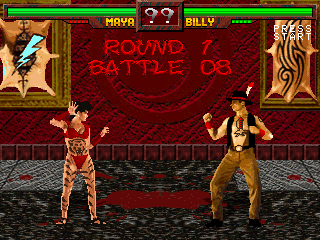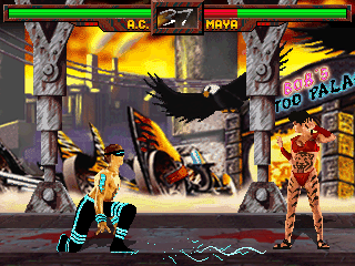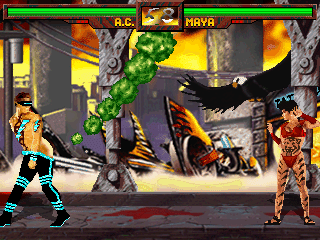 Already we begin to see certain flaws in the design here. Their exotic tribeswoman is your friend's mom in a two dollar bra and adorned with a giant, ugly tattoo that looks like it was done in permanent marker. Still, compared to some of her fellow fighters, Maya is actually fairly normal. She does, however, have the most horrible stage in the game, for the sole reason that it features a loud, low-quality wooping bird call sound that is played roughly every 1.2 seconds. Seriously, if you're somehow inspired to play this game after reading this, turn your speakers down as soon as you see the jungle.