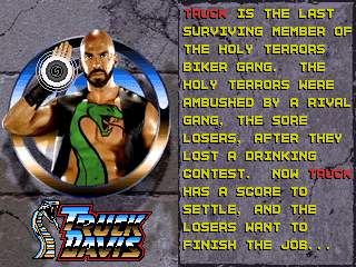 I suppose they were trying to make something scary, but there's "big monster" scary and there's "does it have boy parts or girl parts" scary. According to the game credits, Rhina is played by a female, but I'll have to take their word for it. The bosses don't have any descriptions in attract mode like the regular characters, so I can't tell you what the hell is up with this thing. So I'll just say she got bitten by a radioactive rhino during a stay in Africa and gained the power to protect your truckbed from rust damage.