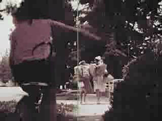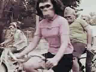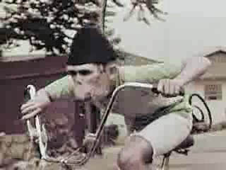 Back to the other girl of the group. Now, the makers of this film know that girls are more reasonable, less risk-taking sorts, what with their home making and child cleaning and whatnot. Us audience members aren't going to believe a girl would drive in front of a car like those rowdy boys. So in order to maintain the documentary-style realism we've come to expect, they must think carefully about what girls are known for. We had Tinkerbell earlier being so forgetful she got hit by a truck, that's a start.. Oh! Being bitchy! Of course! As the guy in the hat ponders if he left the iron on, Nelbert Swybach is talking shit and swinging her fists at anyone who comes near. Despite the fact that half the group is dead, the road is still too crowded for her liking, and she starts swatting at the others to keep them away. She finally gets fed up, turns up a driveway and onto the sidewalk, still shaking her fist and presumably cursing at the other monkeys for breathing her air. Riding on the sidewalk is strictly banned in Freak City and many others, and for a brief moment the film inspires hope that we'll get to see the Monkey Police bust onto the scene. You're a loose cannon Koko! BUT I GET RESULTS OOK