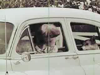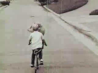Back with the group, who by the way doesn't seem to have noticed or cared that one of their friends was just plowed into by a car in front of them, as they continue down the road. Imagine if you were driving down the road one day, glanced out the side window, and saw this riding up beside you. The music is still the kind you'd find in a 1950s short film demonstrating the wonders of modern appliances, subtly implying that if you don't practice safety precautions, not only will you die, but the world will keep right on being a happy bouncy place without even noticing you.