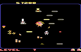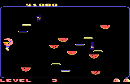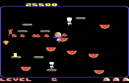 There are also piles of food of varying types scattered around, and that's where things get interesting. Charlie has no defenses of his own, but he can run over to a pile, pick up a handful of food, and chuck it in any direction. He can take out the chefs this way, so the game becomes a matter of running from pile to pile, keeping the chefs at bay and working your way to the other side of the room. This was the first game I ever played (and has to be one of the first games period) to have a instant replay feature, and it deserved it. There was nothing cooler than getting cornered by several chefs, making a last second break for it between two of them, and having them nipping at your heels just as you reach a pile of tomatoes, whip around, and blast the shit out of your aggressors with firey (or at least room temperature) fruit of vengeance. Then getting to see it all again because the computer decided you had done a pretty good job (and it was hard machine to impress, too). The piles had limited supplies, which only increased the tension, with the exception of watermelons. For some reason watermelons never ran out of ammo, but only appeared every few stages, so it was a nice stress reliever after a couple of close calls to get to a melon and go all Rambo With Fruit And A Big Head on all comers until you had to go grab the cone right before it finished melting.
