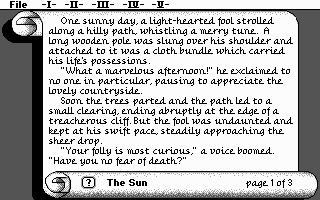 Try to follow me here. The Fool's Errand is a story, made up of dozens of chapters, only a few of which are available to you at the outset. In addition to telling another small part of the story, each chapter has a puzzle associated with it, that one must solve in order to open up another chapter. Solving puzzles also adds another piece to the map the Fool is given at the beginning of the game, but the pieces are not placed in any order. So you're hopping from one chapter to another, usually not in sequential order, solving puzzles and adding to your map, until finally the whole story is revealed to you. You only have one puzzle left, the first chapter, the one where you got the map to begin with.. And you realize the puzzle is to arrange all the pieces you've been given along the way, using clues hidden in the chapters that you may not have realized were even there. It's a meta-puzzle, to use the designer's term; a puzzle that uses other puzzles as its clues. Then when the map is assembled, it reveals 14 more puzzles to be completed to at last reach the finale.