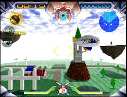 It's a better concept than it sounds, honest. Each level is a collection of floating chunks of earth and various structures, and hidden around the level are four jetpods. Robbit, the robot bunny (presumably the brother of Rabbot from ATHF) has to hop around and collect these pods to move on to the next level. He can shoot lasers, for what that's worth, but his main feature is the ability to leap 50 feet in the air, then jump again in mid air, then jump again after that. So the whole game is basically an acrophobe's nightmare as you jump from one platform to the next, climbing hundreds of feet into the air, your view (from Robbit's perspective, no less) helpfully shifting downwards when doublejumping to the spinning and ever-diminishing speck of ground below so you can properly know when it's time to hurl.
