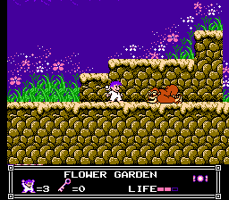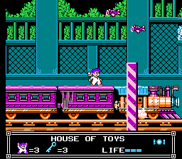 Little Nemo is not a great platformer. The whole animal transformation gimmick -- you feed an animal some candy, you get to make use of his powers -- is sorta neat, but aside from maybe the bee, they all control as bad as Nemo does. None of them can actually jump high enough to get over the enemies you have no other way of avoiding, and each hit knocks you back 20 feet which, more often than not, lands you in more trouble. But I've always had an affection for the game that I can only attribute to the use of its source material. As will become painfully evident in reading this list, I'm fond of games that skew outside the mainstream and have a style all their own, and basing a game on a comic from 1905 is pretty damn skewed. They didn't try to change it much, either; from the introduction with its surreal calliope/accordion theme to the characters that introduce each stage (who admittedly serve no purpose other than to be cameos that no one playing the game will recognize anyway) to the stages themselves, ranging from a forest of mushrooms to a ride on a giant toy train to a house flipped upside down.
