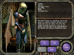 The other aspect is the interactive side of the equation. One major hurdle in non-linear RPGs is that even though you're supposedly given the ability to choose what path to take, the choices can vary widely in quality from game to game. Often, it's a very dull binary approach where you're either good or bad. Your choices in conversation are either "yes, I'll bend over backwards to help you" or "no, I don't want to help, I'll just rob you instead." You're either a rosy-cheeked cherub spreading flowers and gumdrops throughout the land or a heartless killer who stabs people in the eyes because he likes to hear the squishing sound. Part of the reason for this, of course, is that for every different choice, there have to be different answers and new dialog and different events and a whole lot of extra work for the writers and programmers.