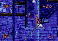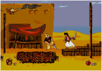 Still, there was something about Aladdin that made me determined to play it the long way. It's nothing more than a side-scrolling action game, where you swing your sword & throw apples at palace guards & wisecracking parrots for a couple of movie-themed levels until you reach Jafar & save the princess from him... but it's one of the most fun games I've ever played. It's very rare that a movie-based game (and vice-versa, for that matter) can truly capture the overall enjoyment of the original film. Capcom couldn't even do it for their much different SNES version of Aladdin... but Virgin Games did it here, & it's mostly due to the wonderful character animation. Even the bad guys were very bumbling & animated. Jon reminded me my favorite one, where Aladdin will push against a wall when he tries to move "into" it. I'm pretty certain that he never has to push anything in the game, so the animation has no purpose whatsoever other than I guess to say AS GOD IS MY WITNESS, I WILL MOVE THIS BUILDING!