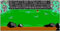This is the first game of its kind that I ever played, where it just dumped me into a world without a clue as to what exactly I'm supposed to do next. So I found myself wandering around a lot. In some spots, if you keep walking up or down, you'll find yourself going in circles. It seems that the Black Cauldron is set on a very tiny planet. Maybe after I'm done delivering my pig to the fairies, I can go clean some volcanoes & take care of my talking rose girl.