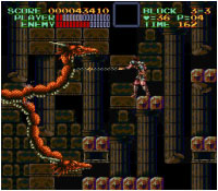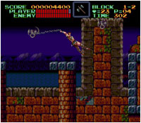 ...ok, according to the game's introduction scene, Simon should be about 125 years old. Boy, he sure gets around pretty quickly for a supercentenarian in a miniskirt & go-go boots. He's even learned some new tricks since his last trek up to Castlevania. He can use his whip as a grappling hook & swing over gaps, & after 100 years, Simon has finally learned how to crack his whip in more than 2 directions.