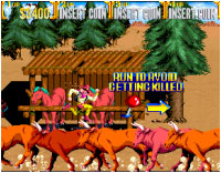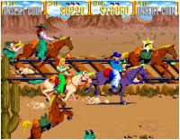 There was a small bit of plot to Sunsetriders. These guys are some group of bounty hunters in the old west, going from town to town & shooting every mean-looking face on a Wanted poster, a few of whom enjoy kidnapping those dancing girls in the big, frilly dresses & cowgirl boots, until you get to the British criminal mastermind, Sir Richard Rose, in his southern style mansion. The gameplay is basically like Contra if it got hit by lightning & sent back to the year 1885. So you choose one of four cowboys & shoot everything that moves. Most people opted for Billy, the blue clad James Dean of the bunch... or Cormano, the red-clad Mexican hombre. I was a fan of playing as Bob, myself. He's the one with the green pants & blonde mullet. Not only did he have a shotgun rifle like Cormano's, but he was also in a more comfortable spot on the arcade table, 3rd from the left. Cormano was Player 4, so he was on the far right, & you had to turn your neck to see the screen properly. Ergonomics be damned.