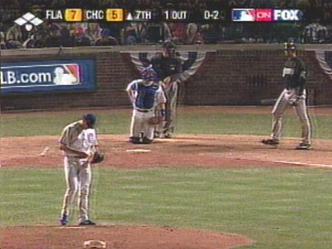 It was the bottom of the ninth. The Cubs were down by three. A man named Steven Bartman wrung his hands furiously. Tonight, he had established a habit of ensuring that 1) he wasn't anywhere near the playing field, and 2) no foul balls were presently being hit to him. Steven Bartman, of course, was the asshole from Game 6 who prevented Cubs left fielder Moises Alou from making a vital out by jumping out of the stands and knifing him in the jugular. It's a natural reflex; any fan would make an attempt to reach out and shank the left fielder in the neck.