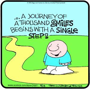 The Joke: The reader expects Ziggy to say, "A journey of a thousand miles begins with a single step!" But Wilson replaces "miles" with "smiles", and places emphasis on this by drawing the "s" differently.