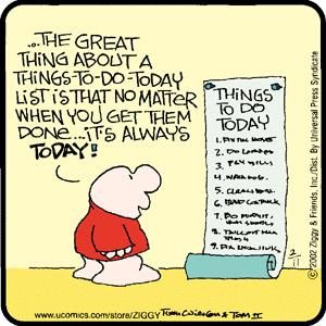 The Joke: Ziggy makes the obvious observation that one always does things on a "things-to-do-today" list today. Or... maybe the floor is yellow because he pissed all over it. Wait, that's not a joke. Fuck it, I don't think there's a joke to be found here.
