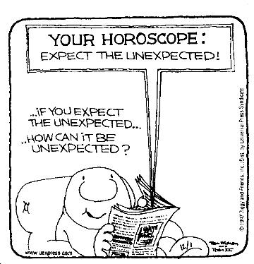 Contrary to whoever wrote that on Ziggy's wall, I contend that it makes perfect sense. "The unexpected" is not just one possibility, but the representation of every conceivable possibility except one, known as "The expected". If someone told me to expect the unexpected, and then I found Pharell in a duck suit making out with Federal Reserve Chairman Alan Greenspan in my bathtub, I would not respond with "Well, duh! It's the unexpected!"