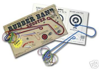 W.A.T.C.H. OUT! ! This "Shooter", which fires colorful rubber bands, is a "new" toy which the manufacturer promotes as "Old Fashioned Fun". Incredibly, at the same time the packaging promotes "Family Fun", there is cautionary language stating: "FOR TARGET PRACTICE ONLY! DO NOT AIM AT PEOPLE...." Rubber bands should never be sold as toys, and have the potential to cause serious eye injuries.