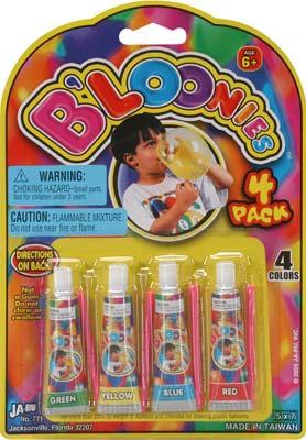 W.A.T.C.H. OUT! Young children are encouraged to "CREATE FUN B’LOONIE SHAPES!" by squeezing out a ball of plastic from one of the enclosed squeeze-tubes, and to "stick [it] on the end of the blowpipe." The gooey concoction contains chemicals such as "poly vinyl acetate", ethyl acetate", and "plastic fortifiers". Flammable chemicals and related chemical fumes should not be part of a child’s toy, much less one intended to be used in or near a child’s mouth and eyes.