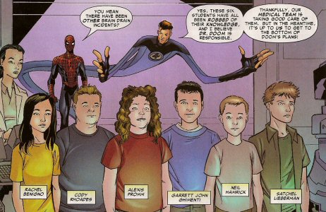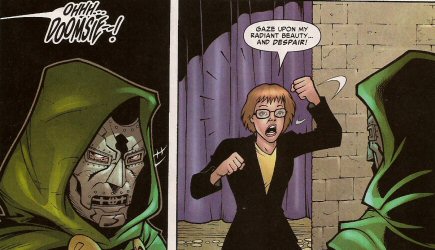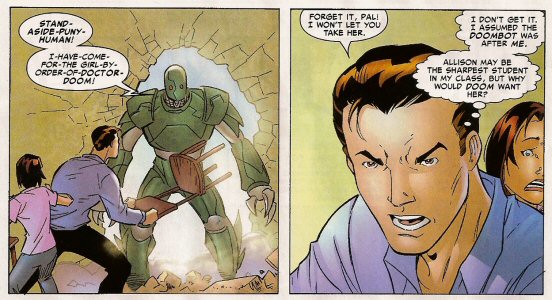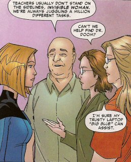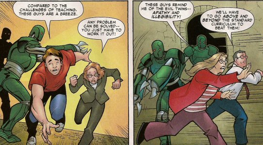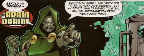 Dr. Doom just stands here holding the canister out while the teachers non-chalantly DEFEAT SOME KILLER ROBOTS and SAVE THE FANTASTIC FOUR and SPIDER-MAN, so non-chalantly in fact that they can banter back and forth about, you guessed it,