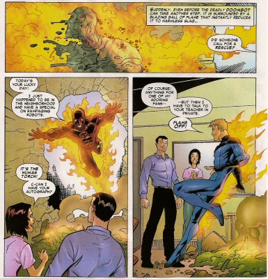 Suddenly, even before the DOOMBOT can take another step, the Human Torch flies in through the hole in the wall and, if my perception of three-dimensional space is accurate, engulfs the Doombot, the little girl, Peter Parker, and the wooden desks and teaching materials in the classroom in deadly fire. Artist Ron Lim (who drew the comic with his leg instead of with his arm) isn't high profile enough to get one of those coveted "the Hulk is now 13 and Betty Ross is a facetious monkey" re-imaginings where the artist is so good he only has to draw one page every four months, so he isn't about to give too hard of a shit about the spacial physics of fire attack. He's not even going to draw in parts of the face if he's got the whole body in the shot. Need pupils in your eyes? Sorry Pete, Ron Lim had to draw a shoe!