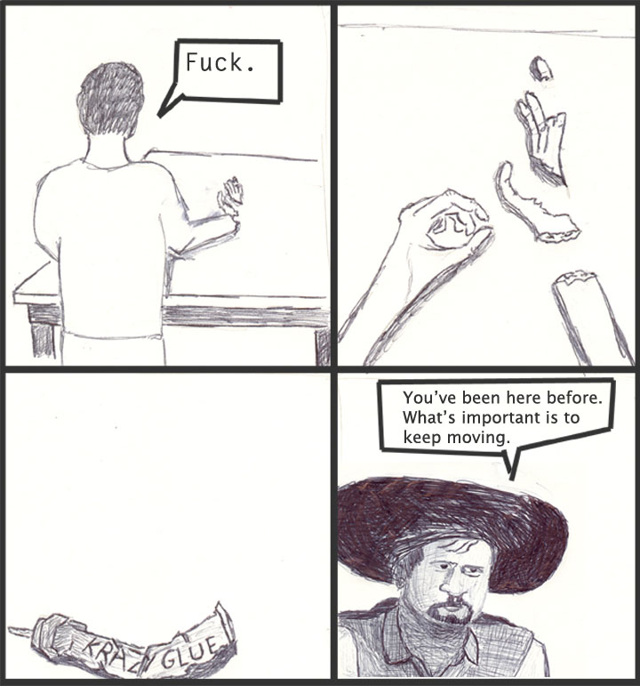 Bonus content: As a continuation of the whole 'falling apart and unable to put yourself back together' thing, I present this: So your whole shit is busted. So the fuck what? Throw your limbs in a sack and keep moving. _________________ "You're a pussy, Strong!"