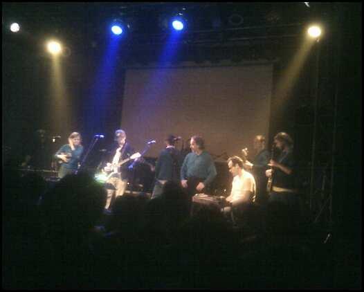 In the center, you can see Sam Beam, aka Iron & Wine, with his back to the audience like he always does when he's not actually singing. It's a shame I couldn't get a picture of his goofy-ass beard. Surrounding him are Calexico, Beam's sister to the left, and in the center with his thumbs in his pockets, Salvador Duran.