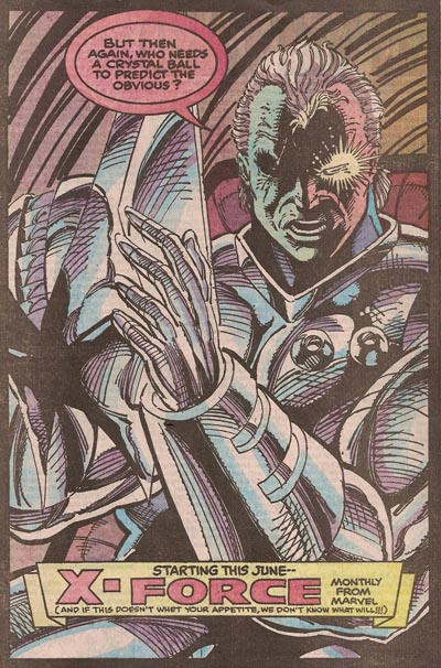 This is a good introduction to how Rob Liefeld, and indeed just about any comics artist in the early nineties, approached their medium: Make it as "dynamic" and "gritty" as possible. In this case, "dynamic" involves a whole shitload of lines on the face, some foreboding shadows obscuring the general middle-of-the-face area, and a background that I guess implies he is sitting in front of an enormous Bengal tiger. Also of note: the fingers of Stryfe’s left hand here all taper down in size from index to pinkie, you know, as fingers do. There is also some crazy shit going on behind that binder in the general gauntlet/forearm area. When I attempt to draw, I often fuck up a line and am like, "Oh shit, that’s not how those parts of the body connect," and then I draw like two or three lines to try to cover it up but it just looks shitty. I can excuse it because 1. I am usually just drawing in ballpoint on my binder or something and 2. I am not a professional artist. Rob Liefeld, by contrast, draws a gauntlet going into the forearm all fucked-up in pencil. At that point, he then goes PFFFFT FUCK IT and then inks over it and sends it to the colorist. Then he GETS PAID FOR DOING THAT.