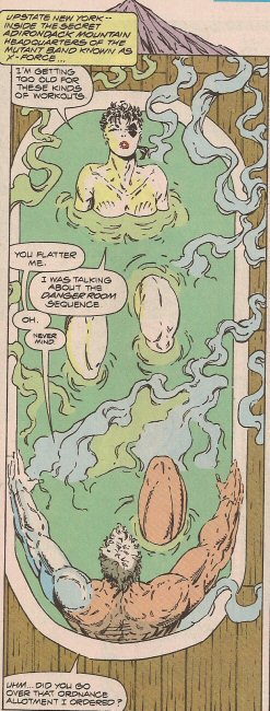 In this comic, X-Force leader Cable (worse than the previous leader, Network) and Domino (with the proportional strength and speed of Petey from Our Gang) enjoy a steam bath. As we know from LIVING ON THE PLANET EARTH, water is varying shades of green, opaque, and gives off swirling plumes of smoke when heated. But some of those smoke plumes are coming from off screen, so maybe there are a bunch of humongous bathtubs in the room or maybe someone is throwing decorative curtains.