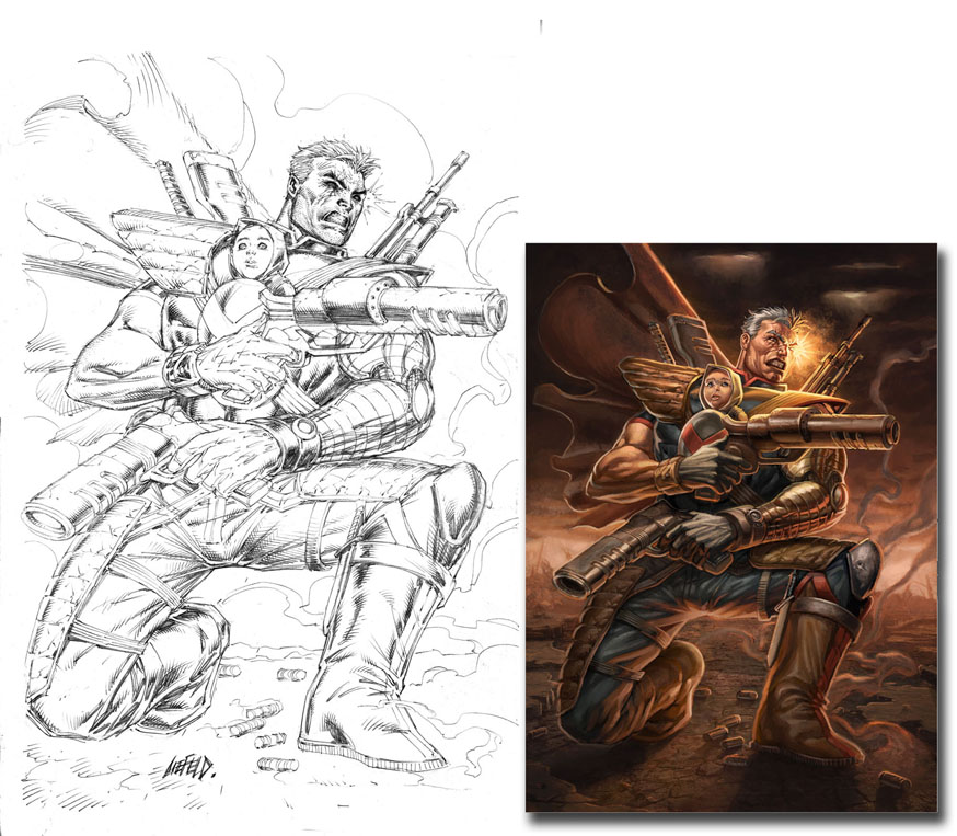 This one is a bit of an experiment. Would Rob Liefeld’s art somehow look even worse as a painting than as a…well, whatever the hell it is that you can call his normal shitassery? Here we have empirical evidence that, yes. Yes, it would look worse. In the original ink drawing, you have a piece of art that, while still reeking of Liefeldian problem areas (elephant foot, bendy guns, elements of the composition plainly drawn completely out of order), it’s not really THAT bad. That all goes out the window when the drawing is given the Thomas Kinkade treatment. (Heh, more like BLAH-mas Kin-LAME, am I right) (too soon?)
