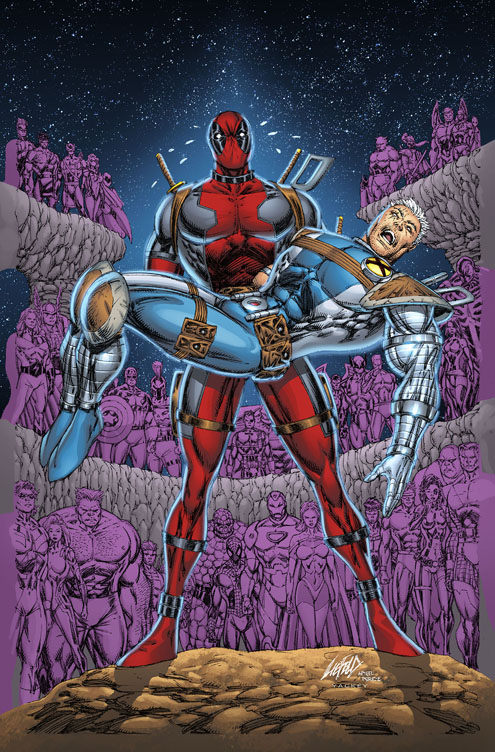 Rather than take a nap, or wait til the next day, or call the publisher and tell them the cover will not be ready on time (which is probably one of the things that Liefeld is the very best at in the world), he just goes FAAAAAART and sprints through Cable and Deadpool. He forgot to draw a second leg for Cable, so he quickly added in a second kneepad and Foot-Type Leg Ending ™, didn’t bother drawing a second arm for Cable, didn’t bother drawing arms for Deadpool, added in some Lil’ Archie-style tear drops, made it so Deadpool’s legs go straight up to his navel, and went with the merest of Jack O’Lantern faces on Cable. He made sure to get his patented WIDE-THE-FUCK-OPEN mouth that he thinks is associated with unconscious or dead people. Can’t forget that.