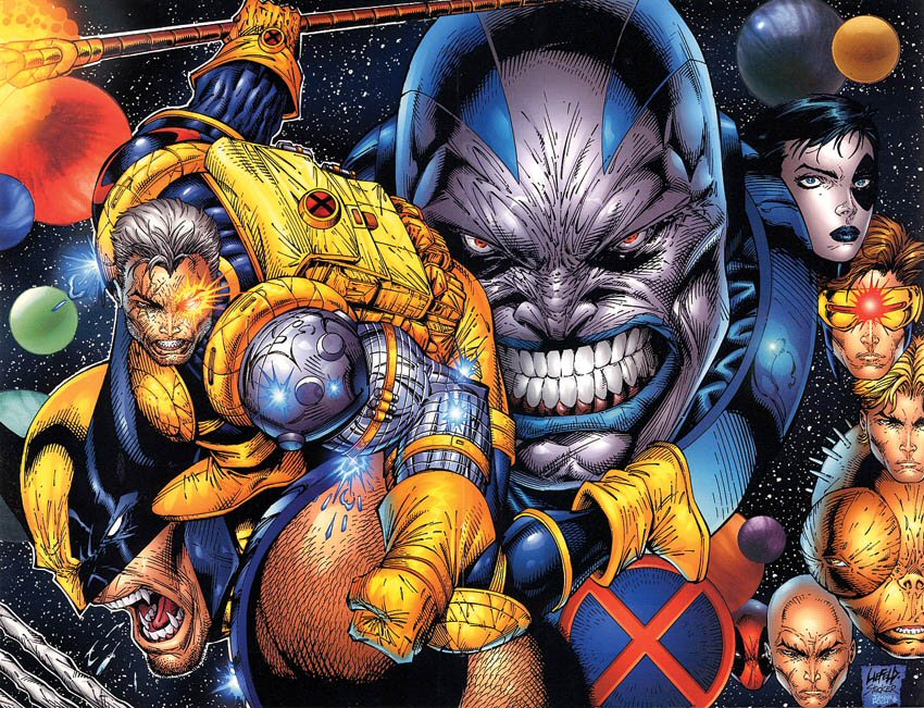 In the background, is that ... is that ALL the planets? We get that they're in space, guy, you don't have to include ALL the planets. And if you do, consider trying harder than "green circle". Bonus points for having Cable take a dump on Apocalypse's face, though.