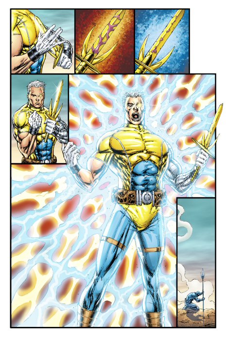 This is probably the worst fight in the history of comics. I can barely figure out what's happening. Shatterstar does his best Todd McFarlane mouth, and about halfway down the red guy dodges a sword jab by shrinking his body and turning sideways, independent of space and time. Either that or we're seeing it from an angle and Shatterstar just tripped. Anyway, they strike the least researched poses possible, and the fight culminates with Shatterstar walking into a jumping karate kick I might throw. Look at him, it looks like he's clicking his heels at the end of a dance number. AND SHATTERSTAR IS CUT. HE GOT SLICED IN THE FACE BY THE GUY'S FOOT.