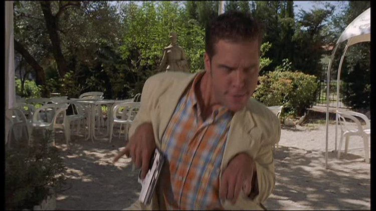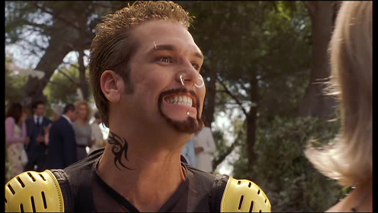 Also, bodily fluids are a good stand-in for comedy as far as Simon Sez is concerned. Dane Cook drools on a couch and dry-humps it after being knocked unconscious. When Rodman drives his car off a cliff and deploys a parachute to fly over the French Riviera and land safely, Dane Cook barfs all over himself in terror. Rodman shakes his head, rolls his eyes and says, dismissively, "Caucasians."