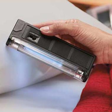 "Harness the same UV sterilizing technology used in hospitals, restaurants and industry in a Personal Germ Eliminator. Compact size allows you to take it anywhere… to sanitize telephones, keyboards, bathroom surfaces, hotel pillows, kitchen utensils and more. The UVC light kills bacteria, viruses, yeasts and molds in seconds, including influenza, salmonella, staph and E. coli."