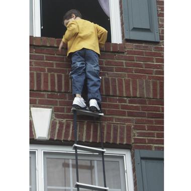 Pictured: Child using escape ladder without adult supervision.